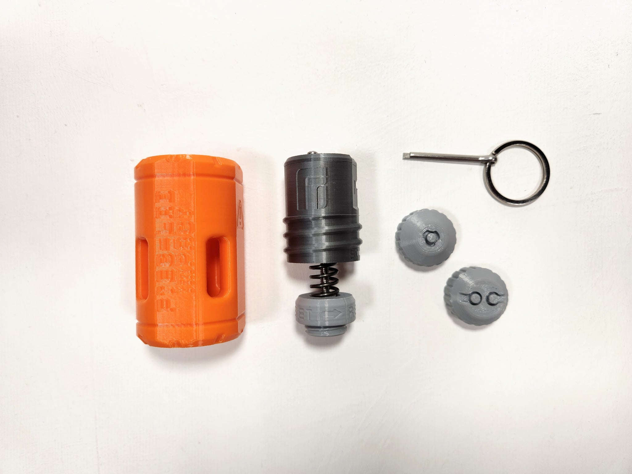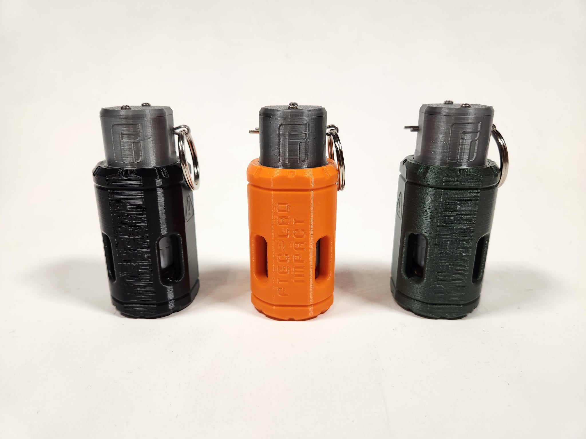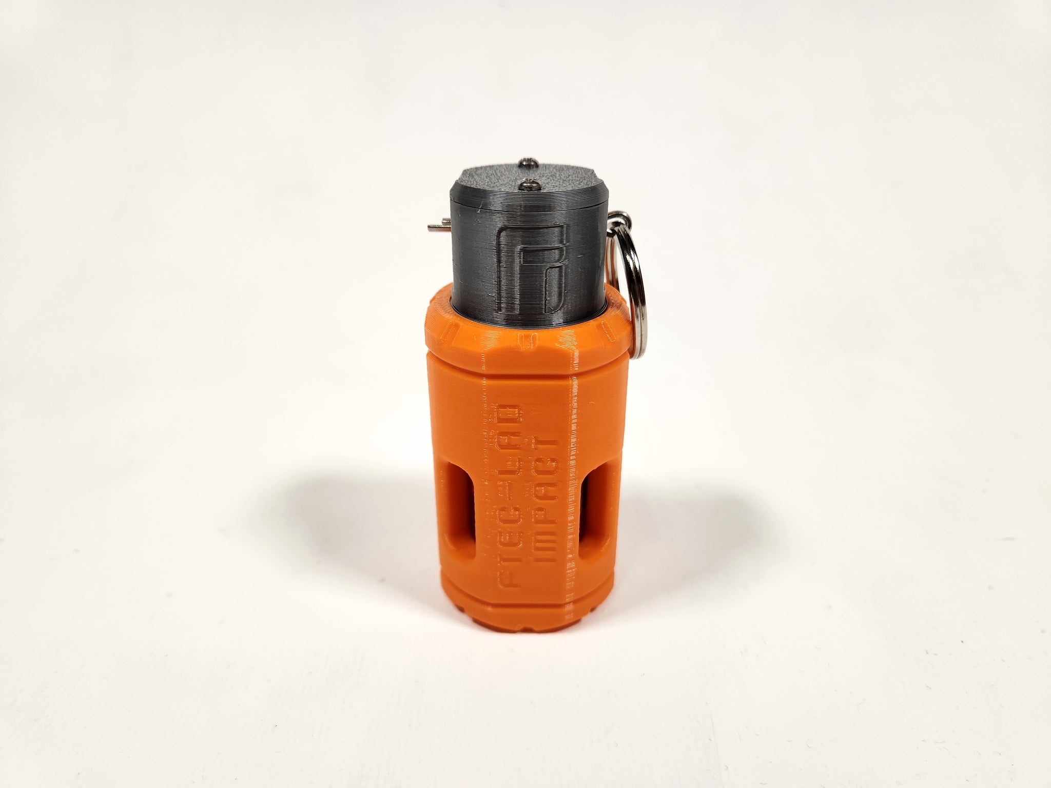 This is the FTEC-LAD Impact. The light acoustic distraction impact grenade is a sound grenade designed for indoor CQB airsoft. It uses common and inexpensive ring caps to produce a loud bang when tossed onto hard surfaces. It features a ring pull safety for a satisfying classic grenade like action.